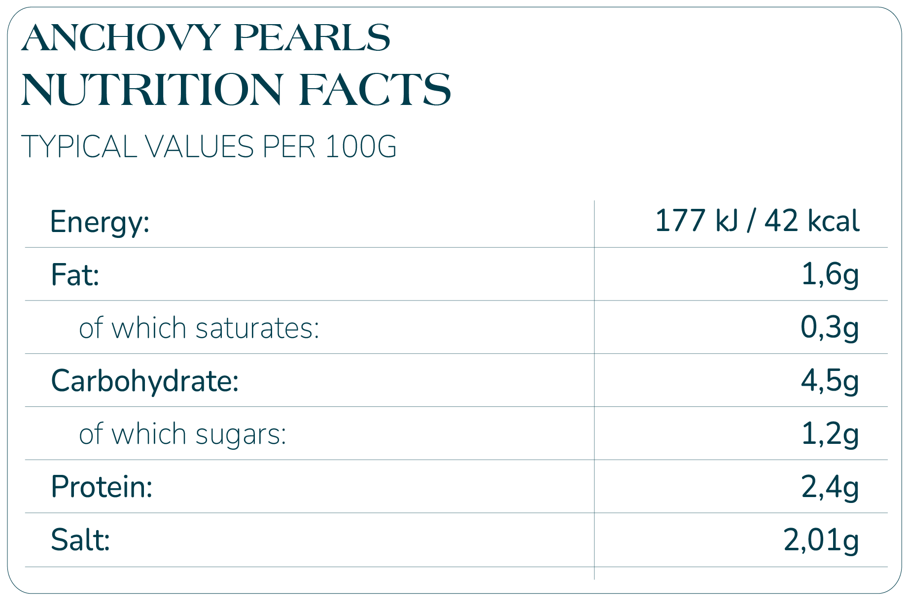 Ingredients: Water, anchovy paste 30% (Anchovy (Engraulis spp., Catch zone: FAO 27), salt), modified potato starch, refined sunflower oil, cuttlefish ink, acidulant (E 330), lemon juice, stabiliser (E 415), spices, antioxidant (extract rich in tocopherols).