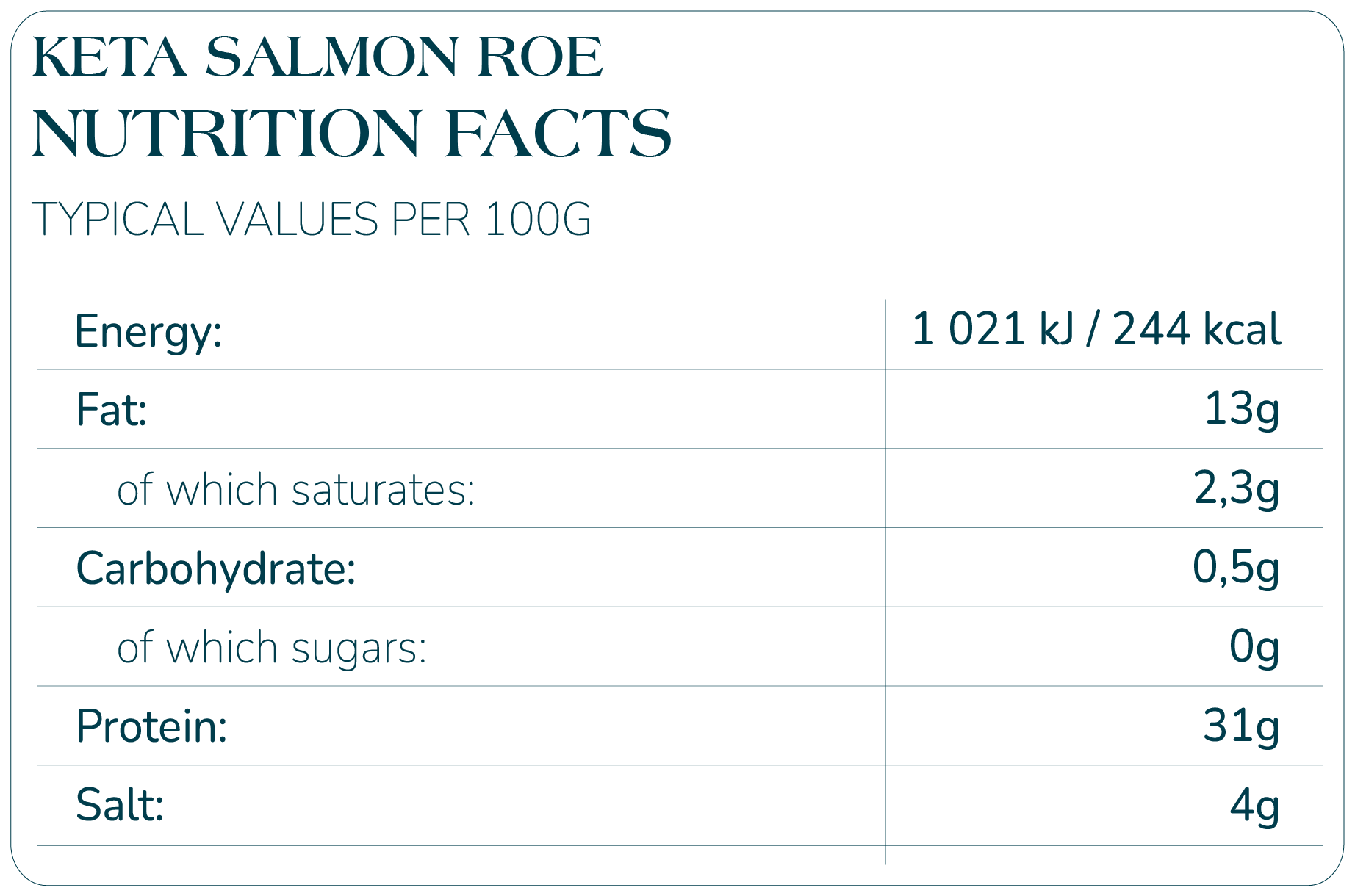 Ingredients: 96% wild salmon roe (Oncorhynchus keta) and salt.