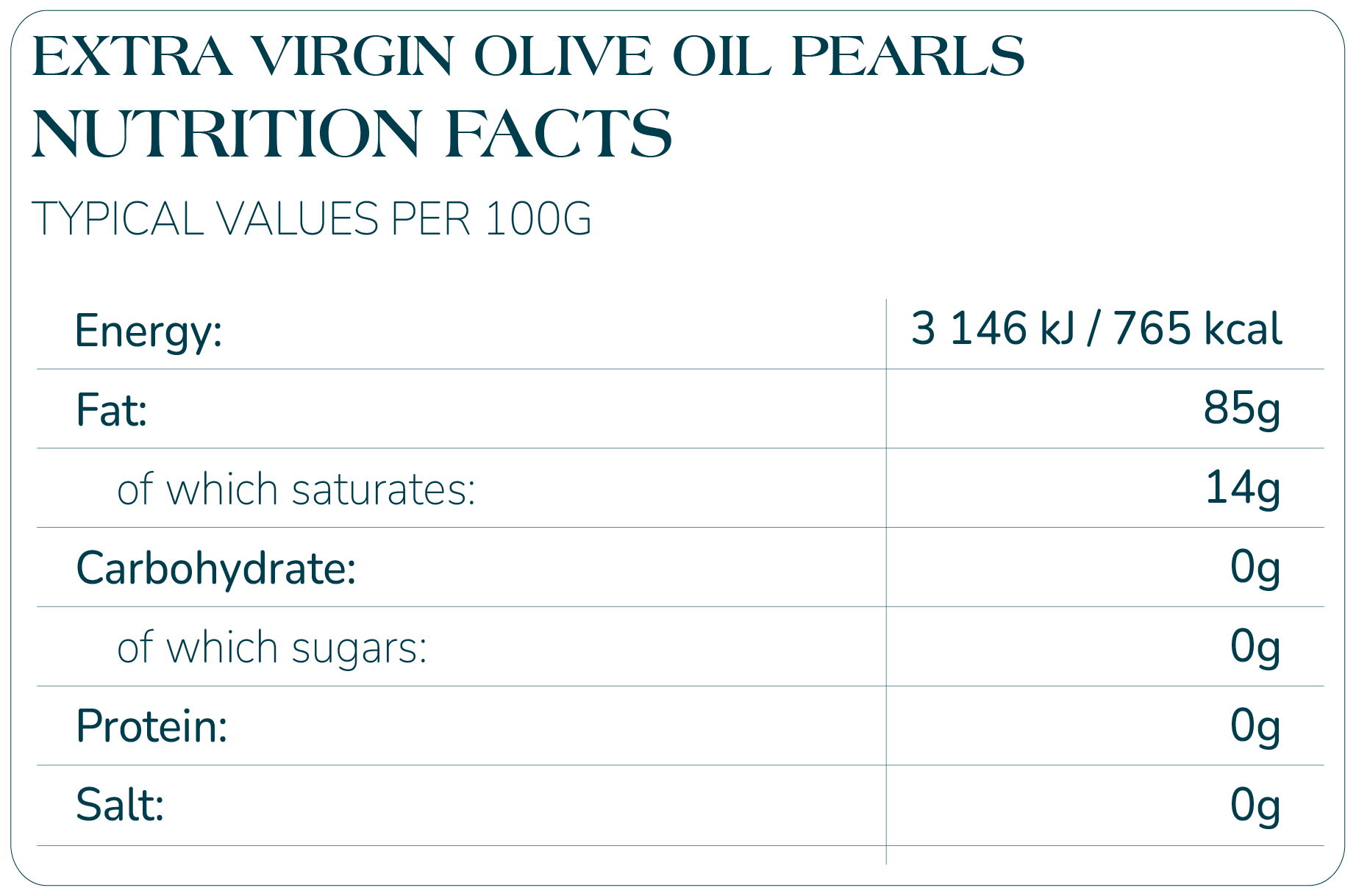 Ingredients: 85% Extra Virgin Olive Oil, water, gelling agent: alginate sodium and stabilizer: calcium chloride.
