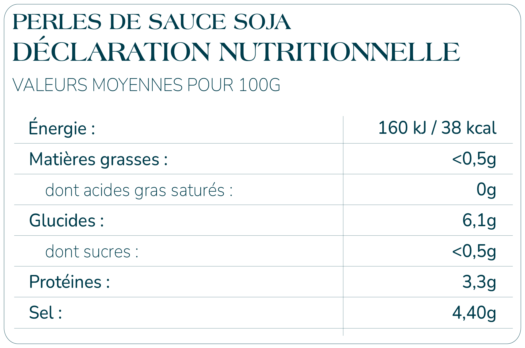 Ingrédients : sauce soja 50% (eau, fèves de soja, sel, vinaigre), eau, épaississant: amidon modifié de maïs, stabilisant: chlorure de calcium et gélifiant: alginate de sodium.