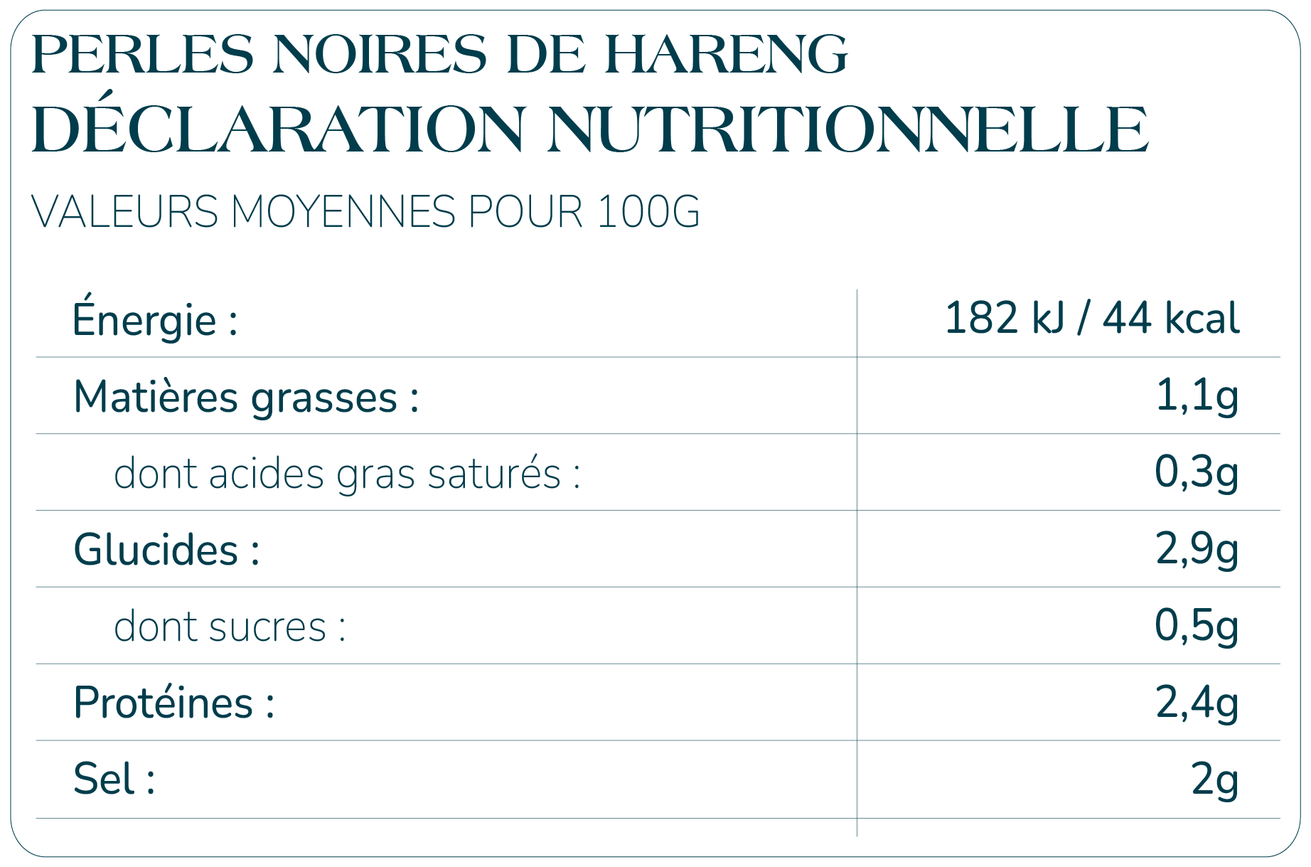 Perles de poisson à partir de filets de harengs sauvages de la mer du Nord, pêchés selon les normes MSC qui soutiennent la préservation des ressources marines. Leur couleur noire est obtenue naturellement, grâce à l'encre de seiche. La version la plus abordable de nos perles de hareng, sans renoncer à un goût exquis.