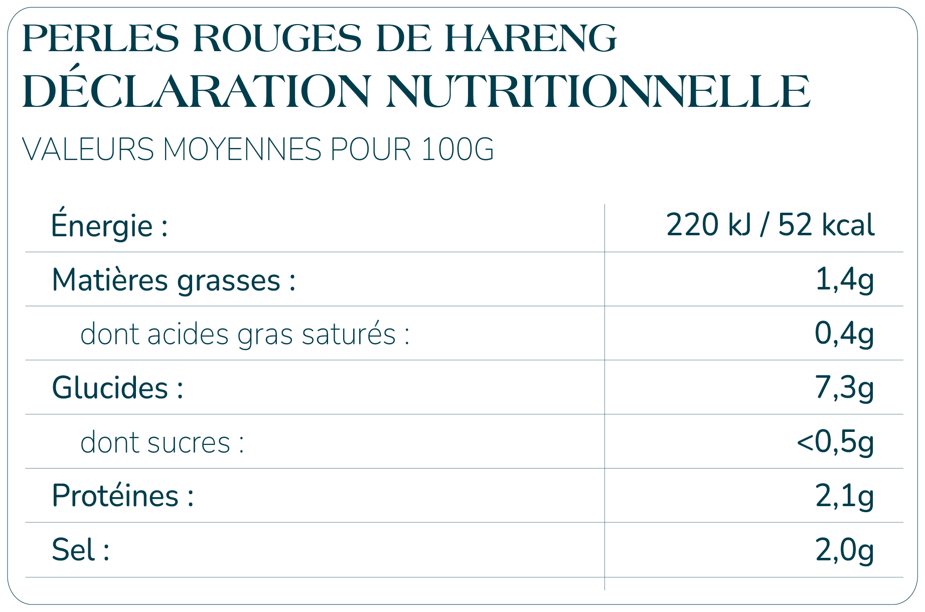 Ingrédients : eau, hareng fumé 17% (Clupea harengus), amidon de maïs modifié, sel, sauce de poisson (extrait d'anchois, sel et sucre), jus de citron, colorants naturels : extrait de carmin et de paprika, épices, gélifiant : alginate de sodium, stabilisateur : gomme de xanthane et régulateur d'acidité : acide citrique.