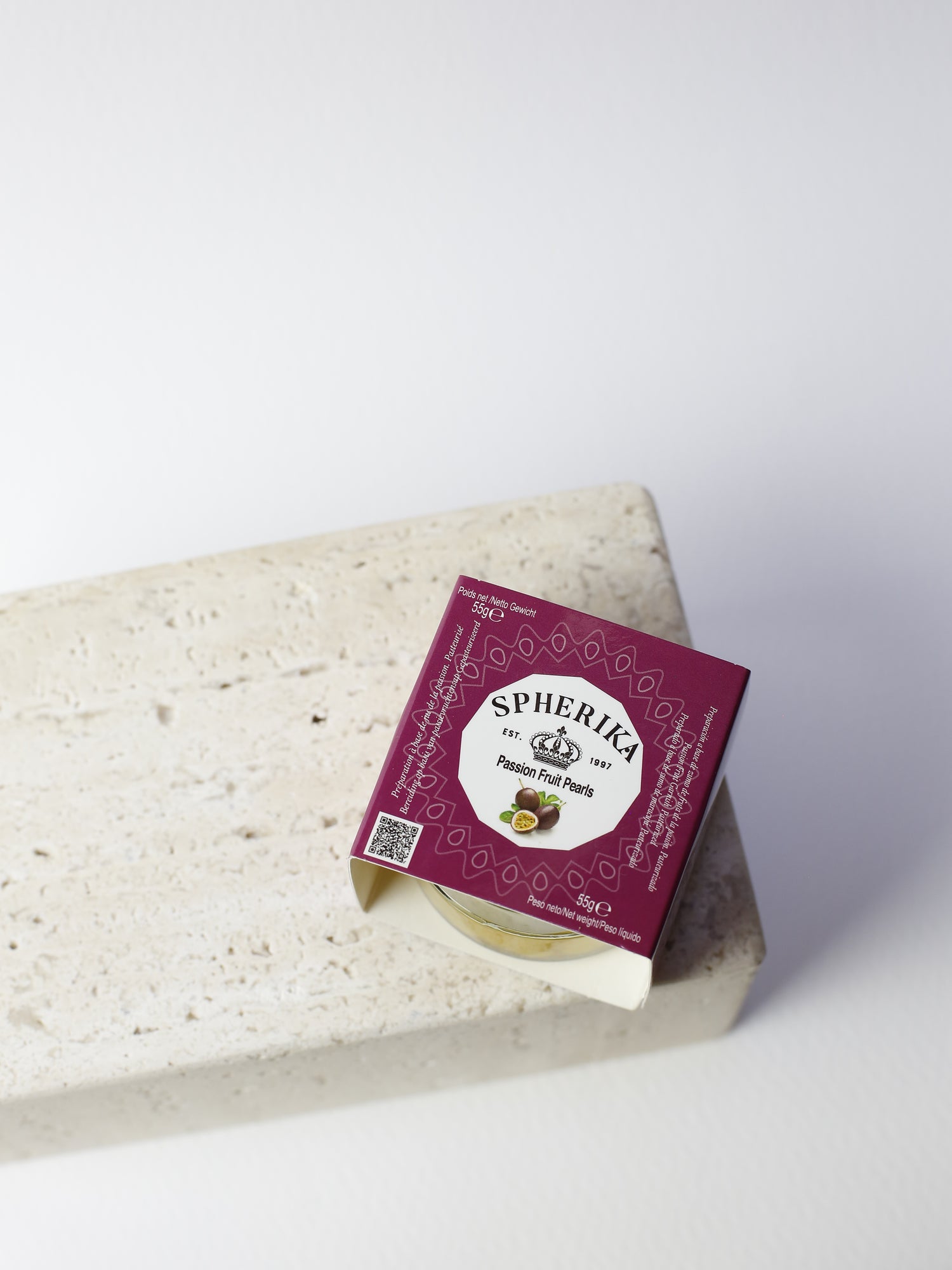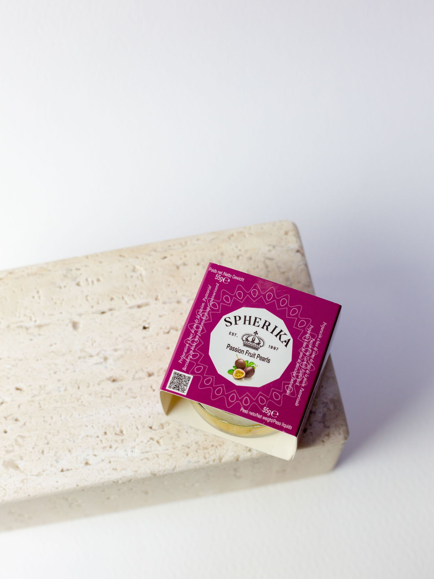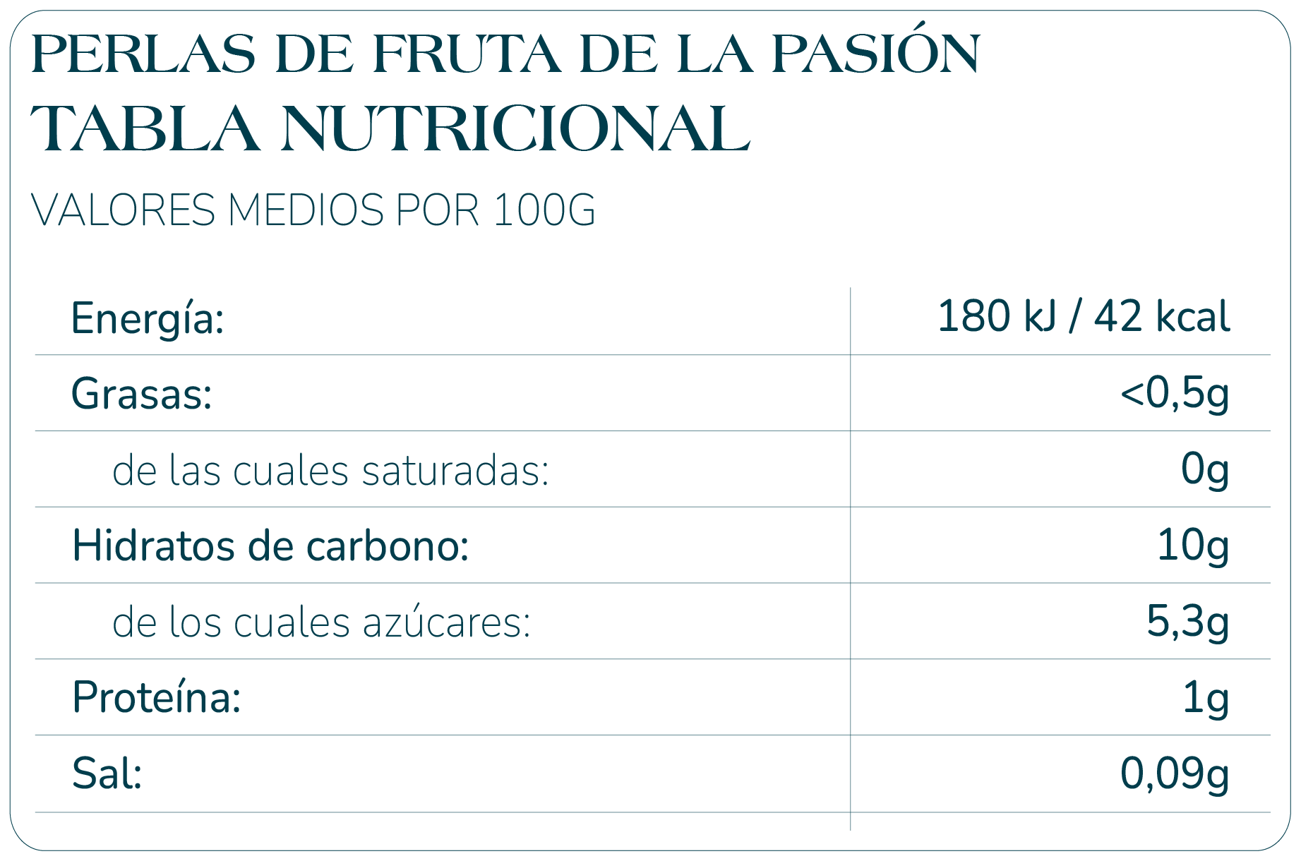 Esferas perfectas y homogéneas, de unos 5mm de diámetro que inundan el paladar con su delicioso sabor a fruta de la pasión al explotar suavemente en la boca cuando las muerdes. La fruta de la pasión procede de América del Sur.