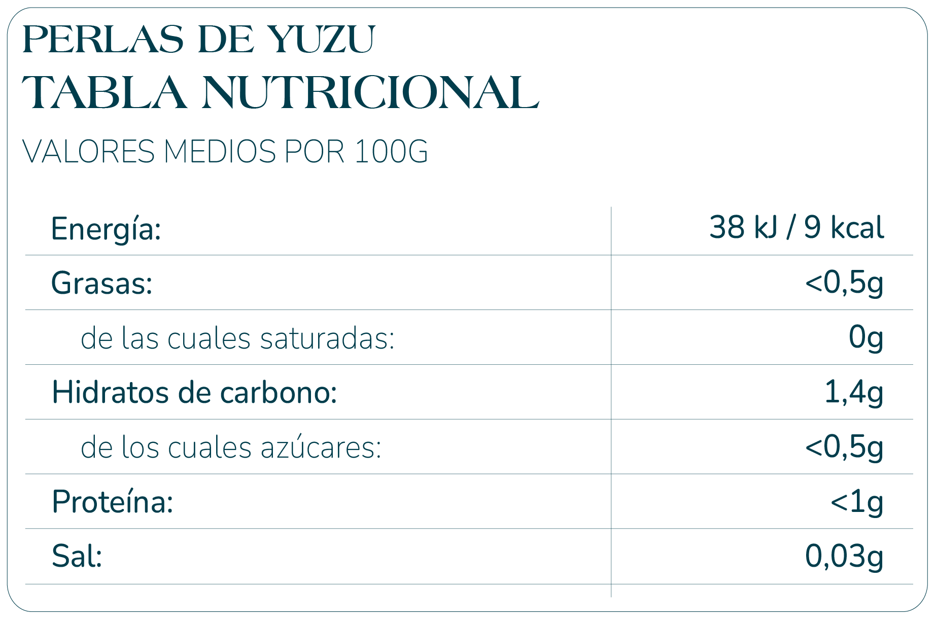 Ingredientes: Agua, 35% de zumo de yuzu, espesante: almidón de maíz modificado, estabilizante: cloruro cálcico, aroma natural de yuzu, gelificante: alginato sódico y acidulante: ácido cítrico.
